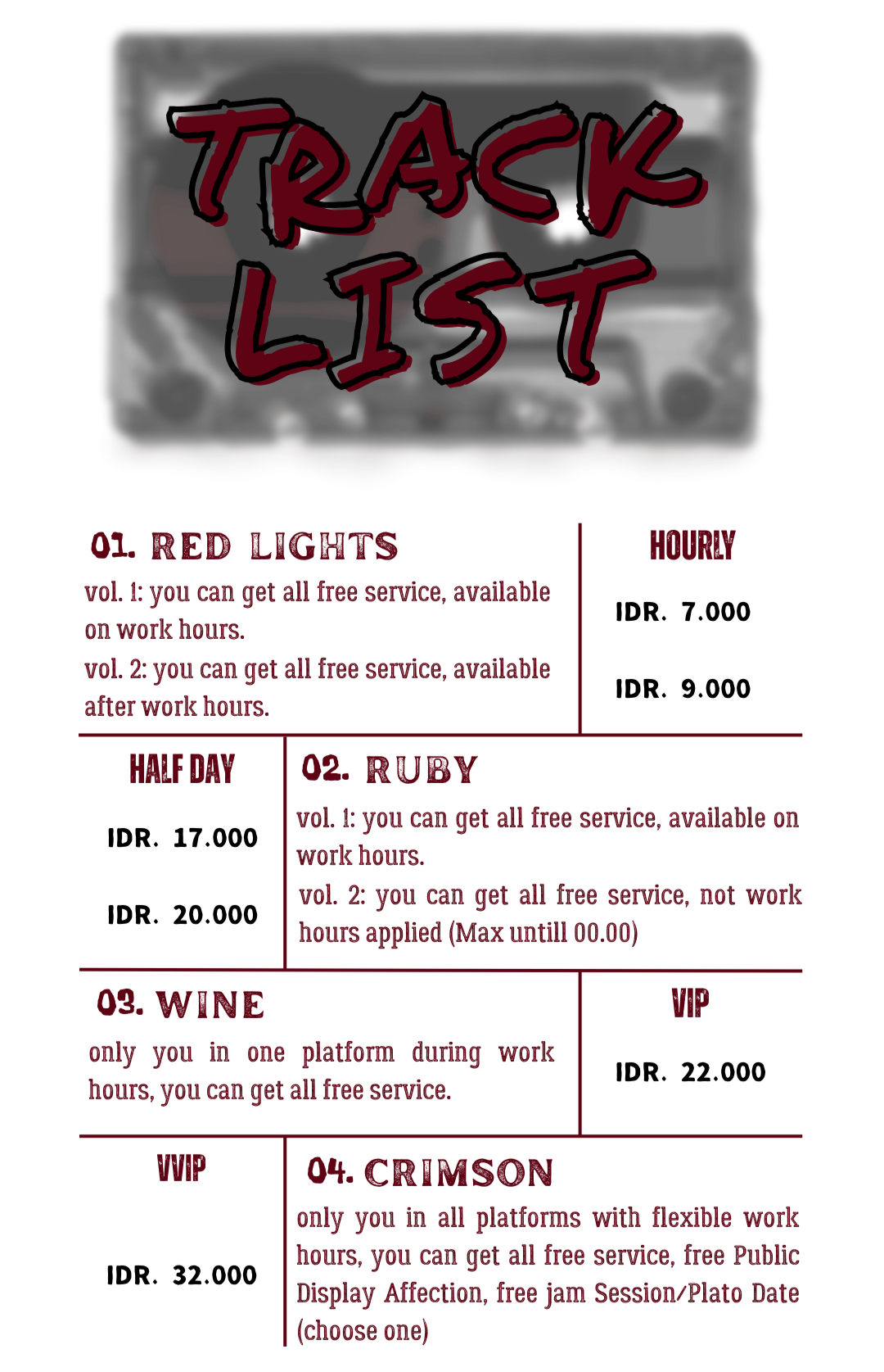 | Jam Session | IDR 6.000/ Hour | |
